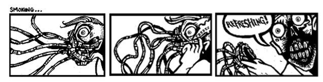 Free Online Comics! Short Scary stories of metaphysics, metamorphosis and mutilations. Each of these tales involves some strange transformation of the human body whether it be real, imagined, terrifying or downright silly. For example “GETTING READY!” is about self perception, arrogance, fashion and mutation. Excited to get dressed up our unnamed superstar fixes his hair, polishes his expensive shoes, dresses in designer cloths and prepares for an evening out. As he finishes up he checks himself out in the mirror and appears to be more than happy with what he sees. One can only imagine his internal dialogue along the lines of “Lookin' Good” or “ You the man!”. Despite all this from our vantage, beyond the forth wall, things look a little bit different. The characters face has melted into some strange organic atrocity. Was it always that way or did he forget to remove those little chemical bags from the new clothes causing this hideous outbreak? Regardless of the answer it seems obvious that no matter how much money or time he spends on his outward appearance, nothing will change who he really is. How about you?