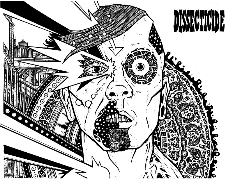 “DISSECTICIDE” is part of a trilogy of body horror graphic novels that I wrote over the winter of 2012-13. I wanted to do three parodies of the arts looking at film, music and in this case fine artworks in order to examine both the positive and negative influences they have on our lives. All of these stories will be featured on the read comics online pages of this site. At the time I was writing this book I was having a lot of trouble dealing with the superficiality of the art world. As an art student I had been much more optimistic about art as a social political vehicle as many people at that age are strong willed activists who are still willing to spill their own blood for a good protest. However as time passed I became increasingly disillusioned by the increasing number of glamour seeking fine artists. It seemed to me that the work which was being produced successfully ( both financially and in recognition) was far more celebratory of commercial pop culture and of virtually no critical value or interest. In many respects the work was little more than intricate escapism and glistening denial.